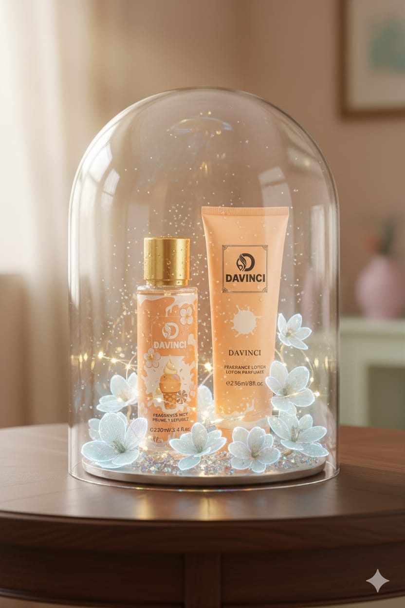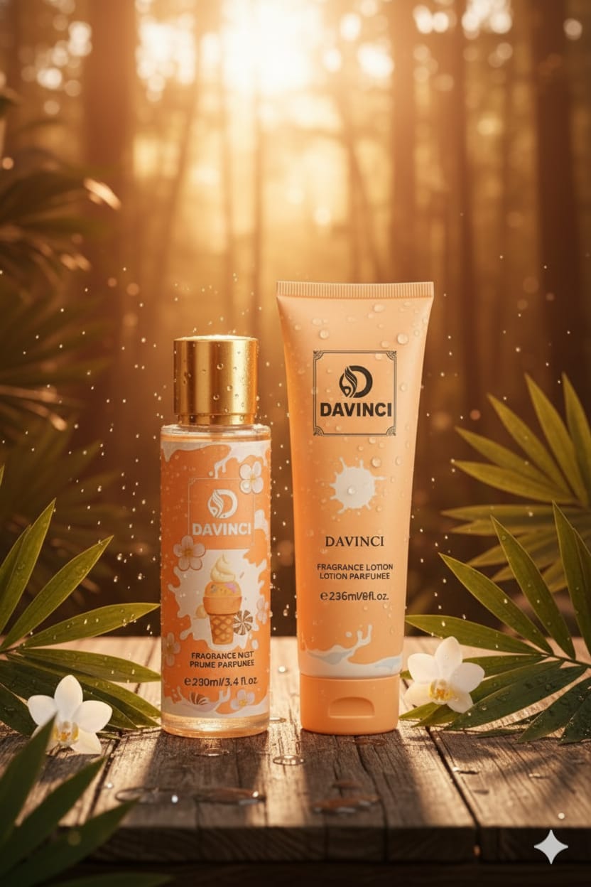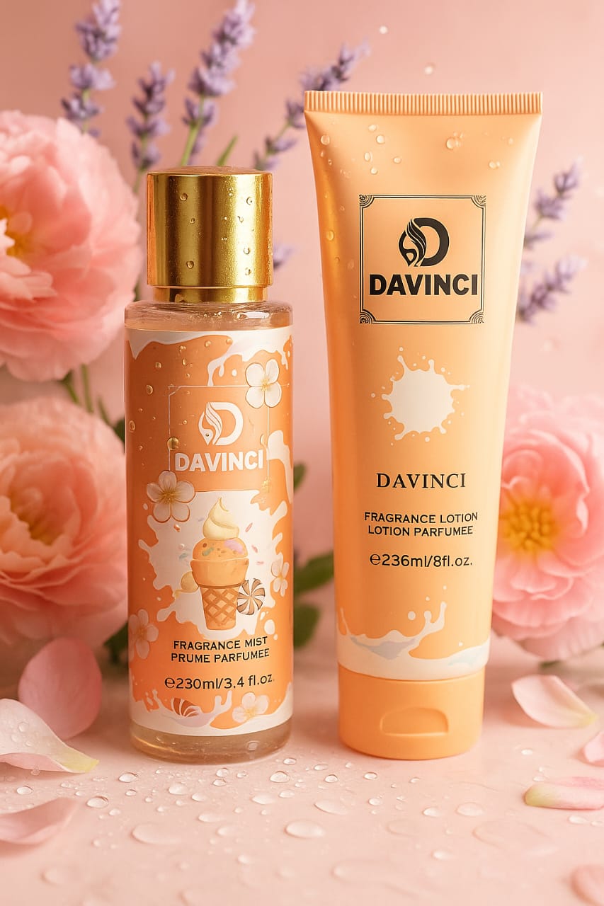 اكتشفي جمال الرائحة الحلوة والدافئة مع طقم DAVINCI العطري، الذي يجمع بين معطر الجسم Fragrance Mist و لوسيون مرطّب Fragrance Lotion بتركيبة فريدة مستوحاة من الفانيلا الكريمية والآيس كريم. تركيبة هادئة، أنثوية، منعشة، ومناسبة للاستعمال اليومي في جميع المواسم.